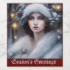 Custom Holiday wine bottle label features a beautiful princess in white fur trimmed hat and wrap with winter foliage in a vintage style portrait. A lovely Christmas themed portrait created with AI generating software. Personalise "Season's Greetings" message text or leave as-is
