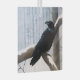 A black raven sitting on a tree branch. Winter and trees all around with snow.
