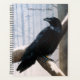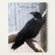 A black raven sitting on a branch. Winter and forest all around with snow falling.