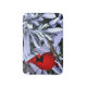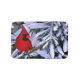 A beautiful Red Cardinal resting among snowy winter Evergreens.