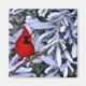 A beautiful Red Cardinal resting among snowy winter evergreens.