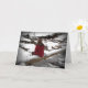 This friendship card features a thoughtful young woman in a red jacket sitting on a fallen log at a partially frozen creek reflecting on the snowy, cold winter scene. The text reads: Just thinking of you... It can be customised to suit your needs.