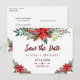Rustic red burgundy and pine green watercolor floral chic script winter Christmas wedding save-the-date postcard with seasonal poinsettias, pine cones, and foliage.