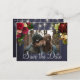 Beautiful red burgundy and ivory cream flowers with green leaves and foliage over a dark midnight blue chalkboard background with strings of twinkle white lights making an elegant chic PHOTO wedding save the date postcard. +++++++ Suitable for chic winter wonderland, Christmas, mountains or farmhouse floral rustic elegant themed seasonal holiday weddings. ++++++++++ Easy to personalise with your details and image!