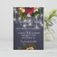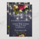 Beautiful red burgundy and ivory cream flowers with green leaves and foliage over a dark midnight blue chalkboard background with strings of twinkle white lights making an elegant chic wedding save the date card. +++++++ Suitable for winter wonderland, Christmas or floral rustic elegant themed seasonal weddings.