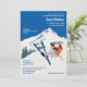 This modern card features the winter landscape of a ski resort. On the front, a skier rushes through the slope. This beautiful scene shows snowy mountains and an intense blue sky. Pine trees can be seen scattered around. This eye-catching yet elegant invitation is great for a ski lover or a ski enthusiast.