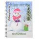 Winter scene with a snowman wearing a pink hat and scarf and carrying a candy cane. A lime green gift bag is beside the snowman with a spiral lollipop and bear inside. "Happy snow days" text. There is a place for your name and date to personalise.
