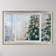 The artwork creates the illusion of having an open bay window looking out at a winter's day with snow-covered pine trees.