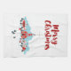 A kitchen towel with a digital image of a painted illustration of a red church and steeple. A bright Christmas star shining overhead. Families out in front arriving for a church service. Winter snow covers the ground and rests on cute bushy pine trees. Merry Christmas written in a red trendy font.