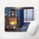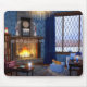 A cosy reading corner on a snowy winter day, with a ginger cat sitting gazing at the blazing fire. Around the hearth are cushy armchairs, with glowing candles and stacks of books and a steaming mug to complete the comfort. Outside a frost-covered willow and beech hedge are obscured by the falling snow.