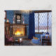 A cosy reading corner on a snowy winter day, with a ginger cat sitting gazing at the blazing fire. Around the hearth are cushy armchairs, with glowing candles and stacks of books and a steaming mug to complete the comfort. Outside a frost-covered willow and beech hedge are obscured by the falling snow.