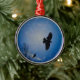 A crow bravely fly through a blue, snow filled winter sky as a perched crow looks on. This is a nice winter or Christmas ornament for a nature lover.