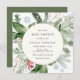 Elegant Winter-themed baby shower invitation features a gold frame surrounded by watercolor evergreen and pine. Personalise with your information or click "Click to customise further" to edit font styles, size and colours.