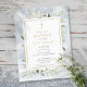 Featuring delicate watercolor greenery leaves on a winter frost background and an elegant gold crucifix, this chic gender neutral baptism or christening invitation can be personalised with your special information, with a silver sage background on the reverse. Designed by Thisisnotme©