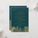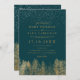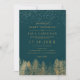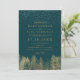 Winter pine trees forest wedding with gold pine trees showing a wonderland of wood land and white falling snow, with elegant and modern typography on editable blue.