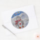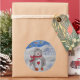 Is this not the cutest and cuddliest winter snow penguin that you have ever seen? He has come out of his igloo at the North Pole to greet you. The little penguin is painted in soft pastel gray and white, with a vibrant orange nose and feet. He wears a red woolly scarf and has a red heart on his tummy. The frosty night sky is full of orange and yellow stars and a crescent moon hangs low.