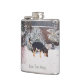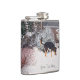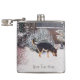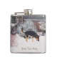 This original snow scene picture on this cute dog hip flask is from a painting of a little black and tan mixed breed dog, he’s sniffing and scratching at the thick layer of freshly fallen snow that he’s just discovered for the first time in the garden. This little dog is named Eddie, he’s a german shepherd cross breed dog and he’s enjoy the cold weather in his winter garden. In the background of this scenic snow picture you can see a little grey garden gnome quietly sitting and reading his book at the side of the small snow covered frozen pond. There’s also lots of snow covered garden shrubs and an old wooden shed in Eddie’s garden, all these bits and bobs add interest to this lovely little winter snow scene on this quality art hip flask. The original painting of Eddie in the snow is tilted "First Snow" and is an acrylic painting. This is a customisable flask, you can personalise it with your own text.
