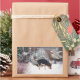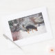 This original Christmas image is a painting of a very cute little black and tan mixed breed dog, he’s sniffing and scratching at the thick layer of freshly fallen snow that he’s just discovered for the first time in the garden. This little dog is named Eddie, he’s a german shepherd cross breed dog and he’s enjoy the cold weather in his winter garden. In the background of this festive picture you can see a little grey garden gnome quietly sitting and reading his book at the side of the small snow covered frozen pond. There’s also lots of snow covered garden shrubs and an old wooden shed in Eddie’s garden, all these add interest to this lovely festive Christmas snow scene sticker
