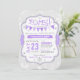 Grey snowflake print background with silver glitter trim and purple and white polka-dot band with lace-look trim edging. Patchwork bunting banner and silver snowflakes winter season baby shower invitation card design.