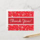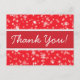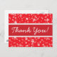 Send a thank you with this postcard covered in white snowflakes on a red background. Card has a red strip across the centre with "Thank You!" text in white letters.
