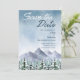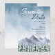 Winter wedding design featuring watercolor background depicting a snowy mountain landscape and pine trees in shades of blue and grey. The text can easily be personalised for a unique one of a kind design for your special day.A chic choice for elegant winter weddings in mountain or forest