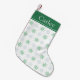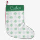 Winter green stars and light blue snowflake pattern on personalised Christmas stocking.