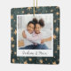 A sweet double sided photo ornament displaying a favourite photo on each side, on a hunter green watercolor background dotted with golden stars. Personalise with a custom caption on the front in handwritten lettering, and add the year to the back.