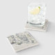 The coasters are gorgeous, a quality feel and heavy weight. They look like a precious archeological find. A rustic stone juxtaposed with a modern floral black and white print. I like the way the print goes slightly imperfect on the cut stone edges giving them a kind-of natural beauty.