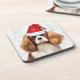 Fun coaster set for the person who loves their Cavalier King Charles Spaniel. This one wears a red Santa hat sitting proudly against a faded WOOF background to decorate your home or office with seasonal pet lover joy.