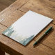 This winter themed green pine trees lined notepad features a beautiful watercolor forest scene with layers of snow dusted evergreens in soft green and blue hues. The elegant, wintry border creates a tranquil atmosphere, perfect for letter writing, note taking, or making to do lists during the holiday season. Its lined pages and calming design bring a touch of peaceful woodland charm to every seasonal message or reminder.