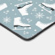 Seamless winter themed pattern with ice skates, snow, snowflakes and stars decoration on turquoise background