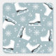 Seamless winter themed pattern with ice skates, snow, snowflakes and stars decoration on turquoise background