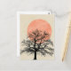 A silhouette of a tree with bare branches in winter with a reddish sun on a light beige background.