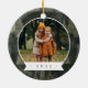 A beautiful double sided Christmas photo ornament displaying a favourite photo on each side in a round layout, on a dark hunter green watercolor background dotted with pine trees. Personalise with a custom caption on the front in handwritten lettering, and add the year to the back.