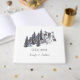 Winter wedding guest book featuring pine trees, mountains, and snow scene with a light watercolor splash on the back of the book. The colours are in shades of grey, green, and blue. Easy to personalise with your own information.
