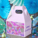 A modern, stylised winter landscape with frosted pine trees and sparkling snowflakes. Favour box with a purple, pink, silver grey and white customisable design for you to personalise with your own text, images and ideas. Image created using a digitally enhanced coloured pencil drawing.