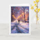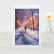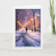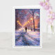 A vibrant impressionist painting of a lone figure walking down a snow-covered avenue illuminated by glowing street lamps. Soft purples, warm yellows, and snowy textures create a romantic and peaceful winter scene—perfect for heartfelt holiday or seasonal greetings.