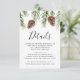 Rustic wedding details card featuring a top border of watercolor pinecones and pine boughs. "Details" is displayed in a modern calligraphy script with your wedding details shown below. Designed to coordinate with our Winter Watercolor Pinecone wedding collection.