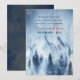 Cute watercolor foggy pine forest Christmas greeting card. The card features a tranquil watercolor landscape of icy mountains and foggy pines, evoking a serene winter wonderland. In the background, towering mountains are painted in soft shades of icy blue and slate grey, with hints of white to suggest fresh snow glistening in the winter light. The peaks fade into a cold, misty sky, blending seamlessly into gentle layers of fog that drift towards the foreground.