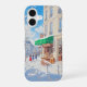 This charming winter scene showcases a Parisian street under a blanket of snow. Soft blues dominate the snowy sidewalks, while beige tones add warmth to the café buildings. A pop of green in the awning and red accents in clothing and signs bring vibrancy to the composition. The artwork, painted with visible brushstrokes, employs an impressionistic style that emphasizes light and texture. The glowing sky and playful details, such as snow-covered trees and bundled-up pedestrians, create a festive and nostalgic atmosphere.