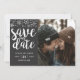 Winter theme save the date card with your custom photo and silver glitter snowflakes. The text says "save our date" in brush lettering with the couple's name, wedding date, and city and state of where the wedding will happen. All texts are editable. Silver and charcoal grey. The back of the card is grey plaid.