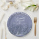 Winter wedding pine trees lake blue art paper plates. Winter wedding blue and white pine trees by the lake with snow gouache and watercolor art napkins. Personalise with your own wedding details. Ideal for a Christmas or lakeside winter wedding. © Original painting and design by Sarah Trett www.sarahtrett.com for www.mylittleedenweddings.com
