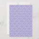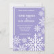Winter Wedding invitation with white snowflakes,frame and names of bridal couple on a light purple background. The backside of the card has a seamless pattern of white snowflakes. invite to a winter wonderland wedding.