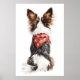 This charming illustration captures the back view of a Papillon dog adorned with a festive red bandanna featuring white snowflakes. The dog’s luxurious fur, blending shades of brown, black, and white, creates a striking contrast against the white background. The whimsical detail in the fur texture and the playful touch of the holiday accessory evoke a warm and joyful winter spirit. Perfect for dog lovers and holiday enthusiasts alike!
