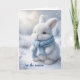 A fluffy white rabbit wearing a blue scarf sits in a snowy winter wonderland, surrounded by frost-covered plants and evergreen trees