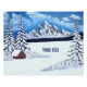 A poster with a beautiful winter scene including snowy mountains, rustic cabin and snow covered evergreens. The image can be personalised. You also have the option to add text. Original artwork by W.B.