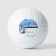 A golf balls with a beautiful winter scene including snowy mountains, rustic cabin and snow covered evergreens. Original artwork by W.B.