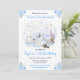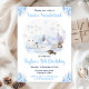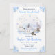 This cute and whimsical watercolor birthday invitation features a watercolor winter wonderland scene with adorable arctic animals, such as a polar bear, penguin, cat, whale, seal and a moose. In the background are snow capped mountains, ice caps and trees. The text combines handwritten script and sans serif fonts for a stylish and modern look. Falling snowflakes and beautiful blue floral arrangements give a winter feel. This is perfect for winter and Christmas birthday parties.