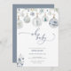 The DELWYN gender neutral Christmas ornaments baby shower invite design has a white background with a watercolor Christmas ornaments adorning the page with wintery snow, snowflakes, icy blue berries and evergreens, all in wintery blues, paired with 'oh baby' written in a fancy handwritten script font with tails in a shade of dark icy blue, and the other important shower details in a grey modern serif font to add visual interest to your winter baby shower invitation. Personalise this modern white Christmas baby shower invitation by adding names, date, time, venue and other details. Perfect for a December baby shower!