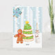 This beautiful holiday Christmas greeting card features a winter woodland scene with a cookie Christmas tree, snowflake and gingerbread man next to a marshmallow snowman.